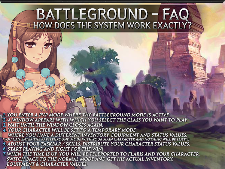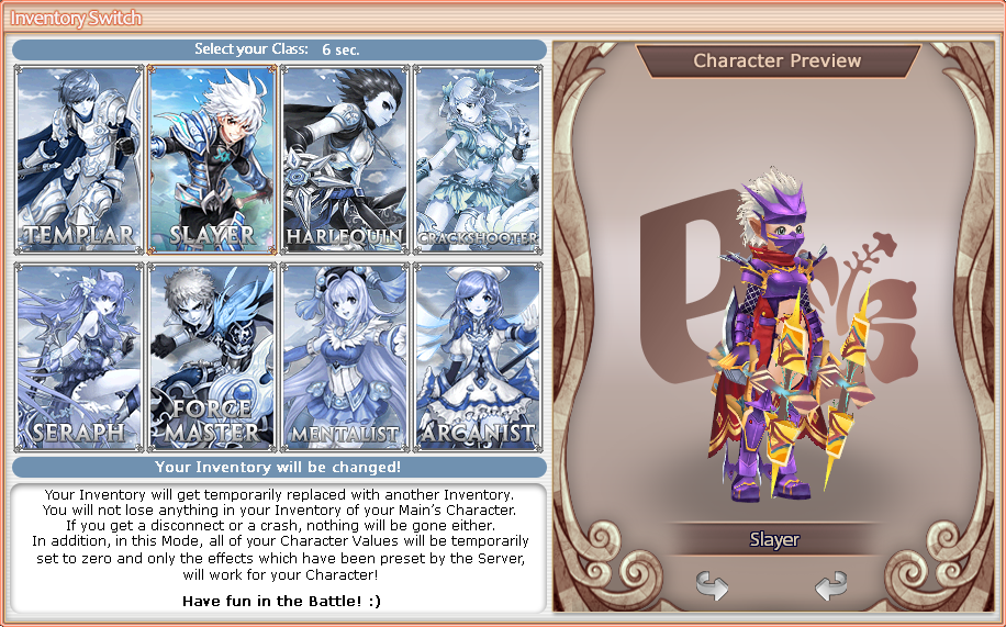 Your Inventory will be swapped for the duration of the battleground siege, you will get it back. If you have models dressed on your character, they will be displayed visually while your in the battleground mode. Every class got setted switches, if you created your taskbar once per class, it will stay for the next times.